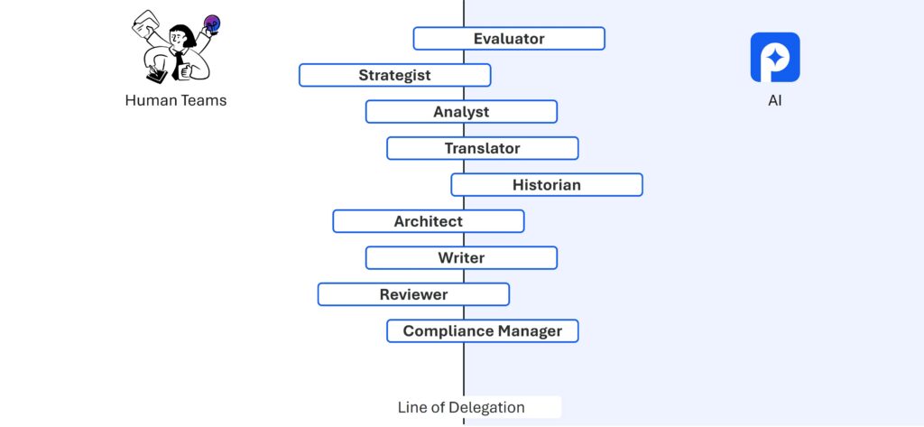 In practice, this means different roles collaborate with AI in different ways. A Strategist might work with pWin.ai to develop win themes and competitive positioning. An Analyst collaborates with AI to interpret RFP requirements. An Historian uses AI to identify relevant past performance examples. Each role adds AI as another collaborator alongside their existing team.